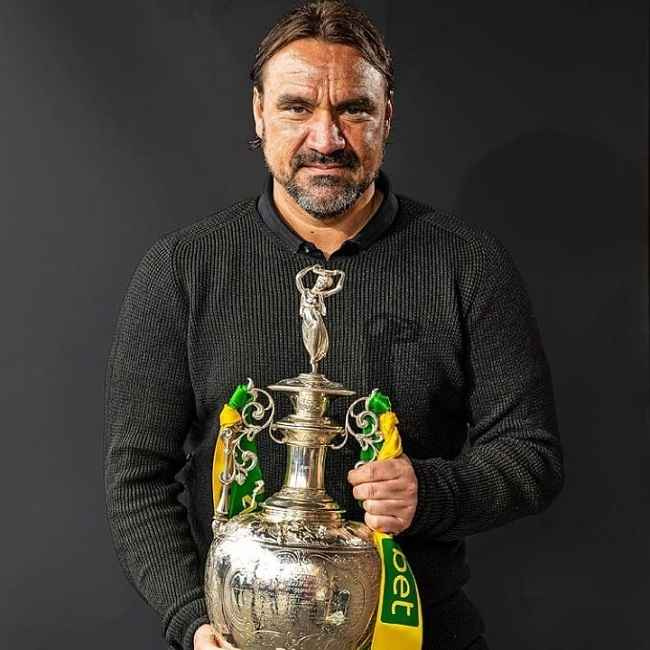 图片说明:丹尼尔·法克(Daniel Farke)与诺维奇城足球俱乐部于 2021 年 5 月赢得的奖杯合影。资料来源:Instagram