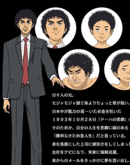 主角。初登场时31岁,毛茸茸的自然卷发型特征。工学博士。[1]大学毕业后,在汽车设计公司工作。他亲手设计过几辆车,也因此获得许多奖项,但却因为上司侮辱他弟弟日日人,愤怒的他便用头锤他的上司间寺,因为这个原因导致他被开除。在那之后历经波折的他收到了来自日日人的信息后,开始以宇航员为目标。