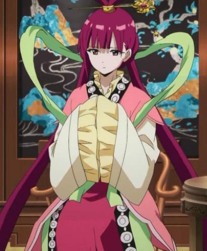 初登场于巴尔巴德(第49夜)(动画第11夜),煌帝国第八皇女,迷宫攻略者,能使用武器化魔装。为了屡行与巴尔巴德之王的婚约而前往巴尔巴德,但途中对辛巴德一见钟情。地位并不高,在政治上没有决定权,希望能成为一名武人;在辛德利亚篇再登场时,透露出她的地位在皇宫中越来越险恶。个性有些高傲,但也有着其纯情的一面。