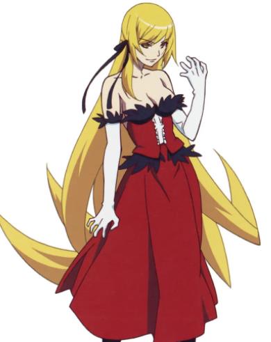 《伤物语》时原本外貌是高大的金发女子,为了寻求死亡而睽违四百年来到日本。却在主角所住的城镇被忍野咩咩和三名吸血鬼猎人分别夺走了心脏与四肢,躺在地铁里奄奄一息时被阿良良木历所救,吸了他的血后捡回一命,并让历成为她的眷属,替她夺回身体。然而历在得知她寻死的想法后反而起了同情心,接受了忍野的提议,夺走她的名字与所有吸血鬼的特性,且必须吸食历的血才能存活。