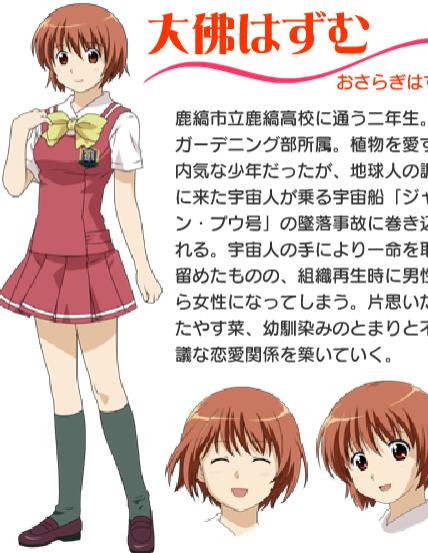 女主角,鹿缟市立鹿缟高校的二年生,属于园艺部,原本是个喜欢植物的内向少年,不过因为被卷进来调查地球人的宇宙人的飞船坠落事故,却在被宇宙人救了一命的同时,变成了女生。(在动画版《女生爱女生》中因为宇宙仁在给大佛·弹进行组织再生时发生的错误,使大佛弹的性别变。)和单相思神泉安菜的对象,青梅竹马的来栖泊之间筑起了一种奇妙的恋爱关系。