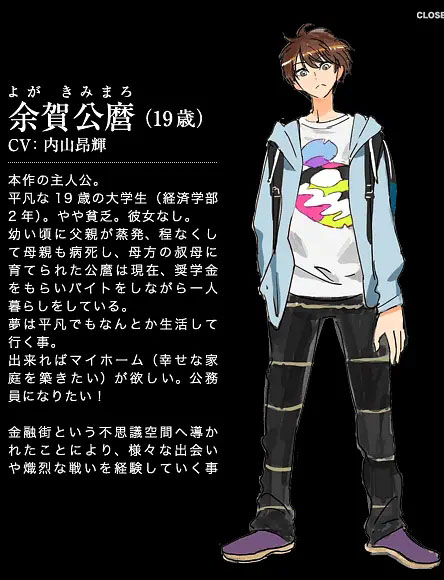 年幼时父亲便人间蒸发了,不久母亲也病死了,并由母亲那方的叔母养育。现在,靠著奖学金及兼职维持独身的生活。梦想是想拥有平凡的生活。可以的话,想有间屋。想成为公务员!在不可思议空间的金融街里,遇上了各种各样的事及经历了炽烈的战斗。在第十话被佐藤托付未来(Asset),十话最后得到黑卡与三国deal。第十一话赢得deal并买回未来。喜欢真朱。