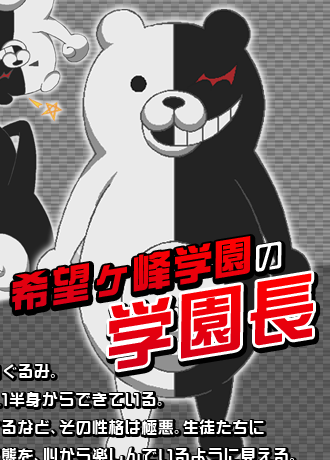 自称是“希望峰学园校长”的玩具熊布偶,由让人感到可爱的白色半边及表情邪恶的黑色半边组成。不管是多么悲凄的场面,都会不停地开一些低级的玩笑,性格极为恶劣。能够在学园范围内近乎无限制地出场,实为在学园内有非常多的复制体。