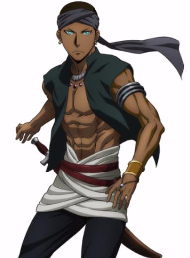 辛德拉国卡迪威王子派的宰相马赫德拉的属下(从本作中的描述来看有可能是马赫德拉的私生子)。在卡迪威与拉杰特拉争夺王位时受到亚尔斯兰的三次救助,在卡迪威死后失去立足点而决定跟随救命恩人亚尔斯兰。之后成为亚尔斯兰的侍卫,并代替达龙守护其安危。