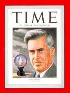 亨利·阿加德·华莱士,艾奥瓦州立学院毕业。1924年起为农业报纸编辑和主笔。后成为农业专家,曾做过高产玉米品种实验,结果在植物遗传学上取得重大突破,后来他从事杂交玉米的生意,获得高额的利润。1928年参加民主党,1933~1940年任美国罗斯福政府农业部长,参与实施“新政”法律(特别是1933年的农业调整法。以提高和稳定农产品价格,保护土壤,贮备储备量和控制生产。一位同事曾这样描述亨利·华莱士:“他总是去响应那些同僚听不到的召唤。”华莱士确实感觉到有一种使命在呼唤他:这位艾奥瓦州出生的前农业部长的儿子说,他最大的愿望是“让玉米种植者拥有一个安全的世界。”