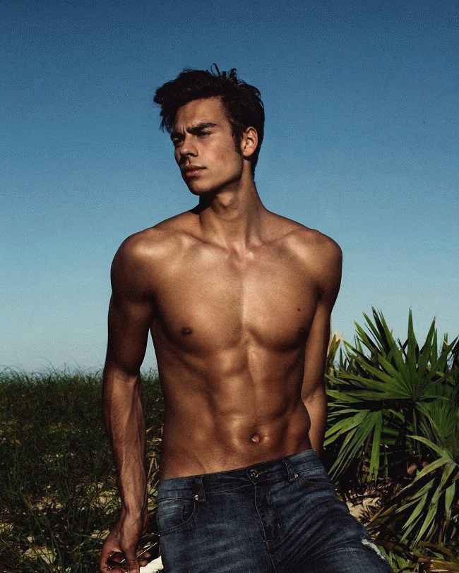 图片说明:Corentin-Huard 为拍摄照片而摆姿势,展示他性感的身体特征,来源:Pinterest