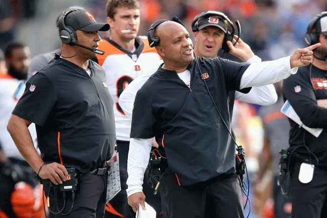 图片说明:Hue Jackson 在比赛中与球员和裁判互动。资料来源:辛辛那提询问者