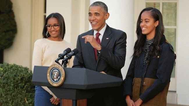 图片说明:Sasha Obama 与她的父亲和姐姐一起参加一个活动(来源:Google)