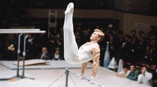 图片说明:Boris Shakhlin 在比赛中表演(来源:Pinterest)