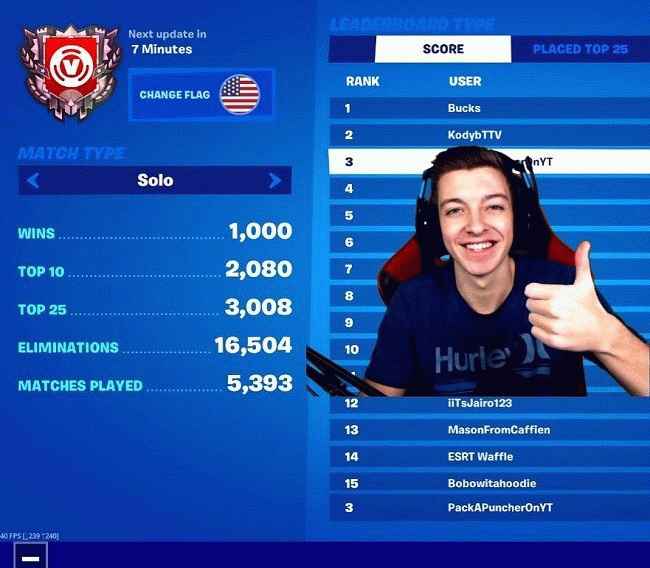 此外,他的《堡垒之夜! (The Black Hole Season 10 Live Event)”是他频道上观看次数最多的视频。这是 Fortnite Season 10 的最后一次直播,直播持续了近 11 小时 54 分钟。该视频有 530 万次观看。紧随其后的是另一个受欢迎的视频“FORTNITE LOOT LAKE TURNED PURPLE!”,观看次数为 290 万。