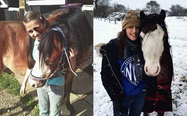 图片说明:Kia Pegg 和她的小马 Flash 过去和现在的照片。来源:Instagram