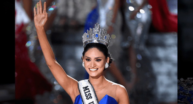 图片说明:2015 年环球小姐 Pia Wurtzbach 在加冕典礼上(来源:CNN 菲律宾)
