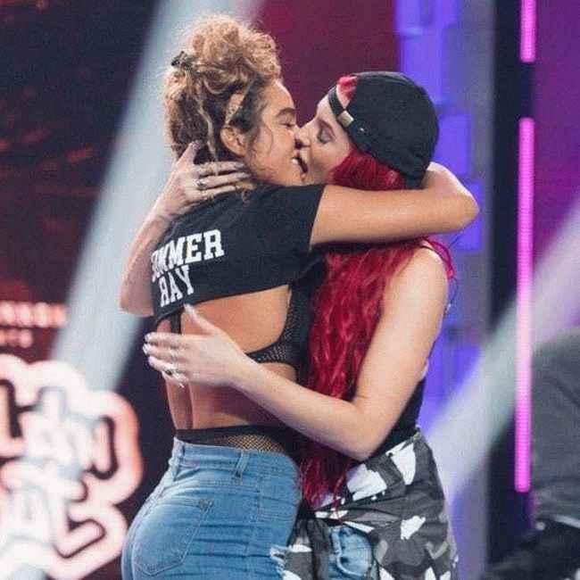 图片说明:贾斯蒂娜·瓦伦丁在 MTV 的“Wild N Out”片场亲吻了萨默·雷,引发了对贾斯蒂娜性取向的质疑。来源:Reddit