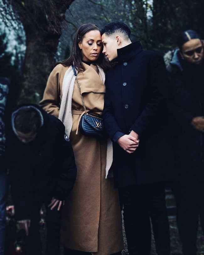 图片说明:格伦尼斯和她的儿子在她父亲的葬礼上(来源:Instagram)