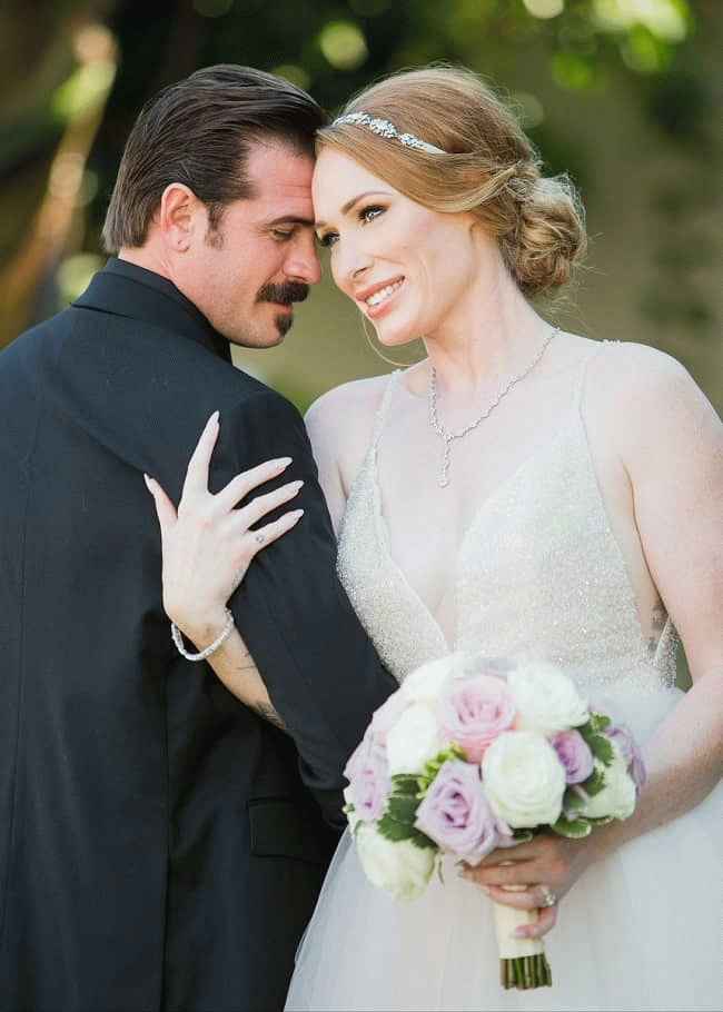 似乎几乎没有几位客人参加了他们的婚礼。新娘康纳斯身穿白色无袖礼服,头戴银色水钻头饰,显得十分华丽。另一方面,新郎穿着黑色西装。