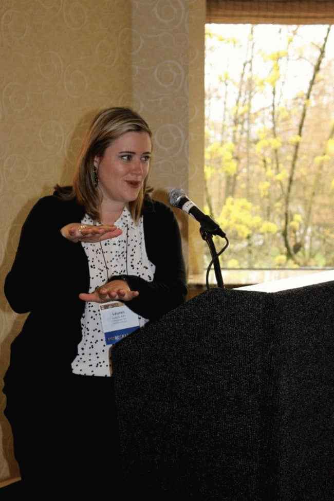 图片说明:Lauren Maltby 在介绍时。资料来源:脸书